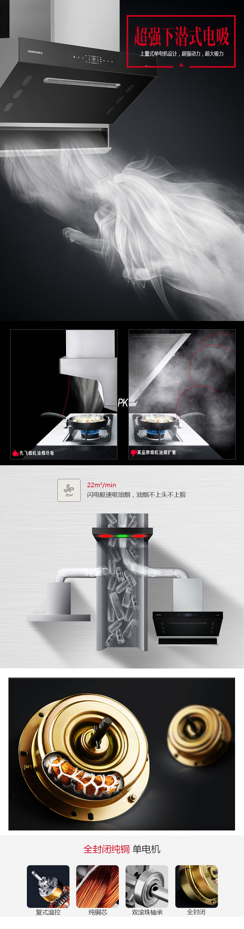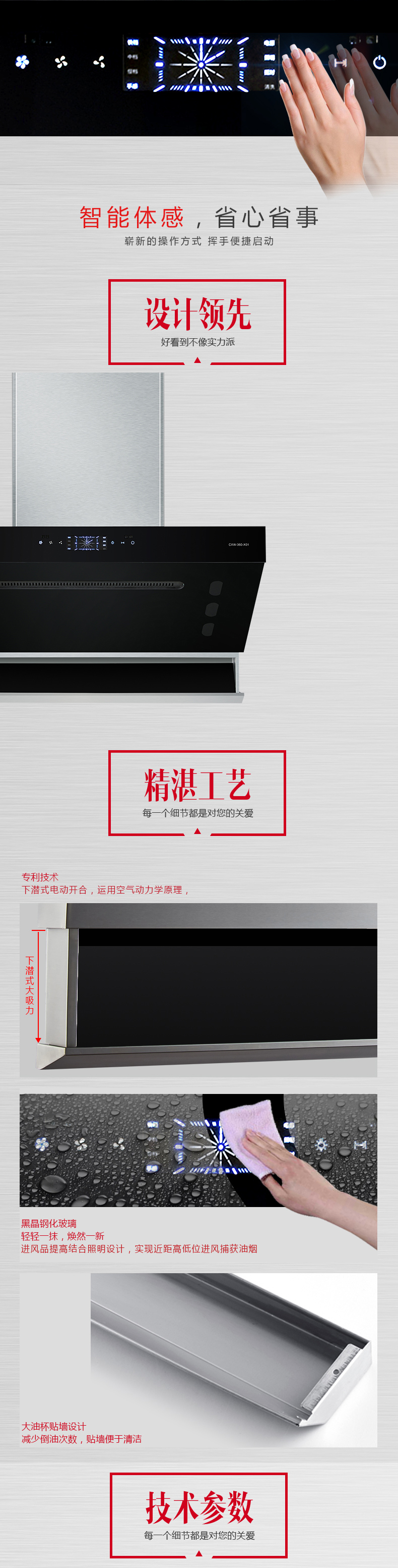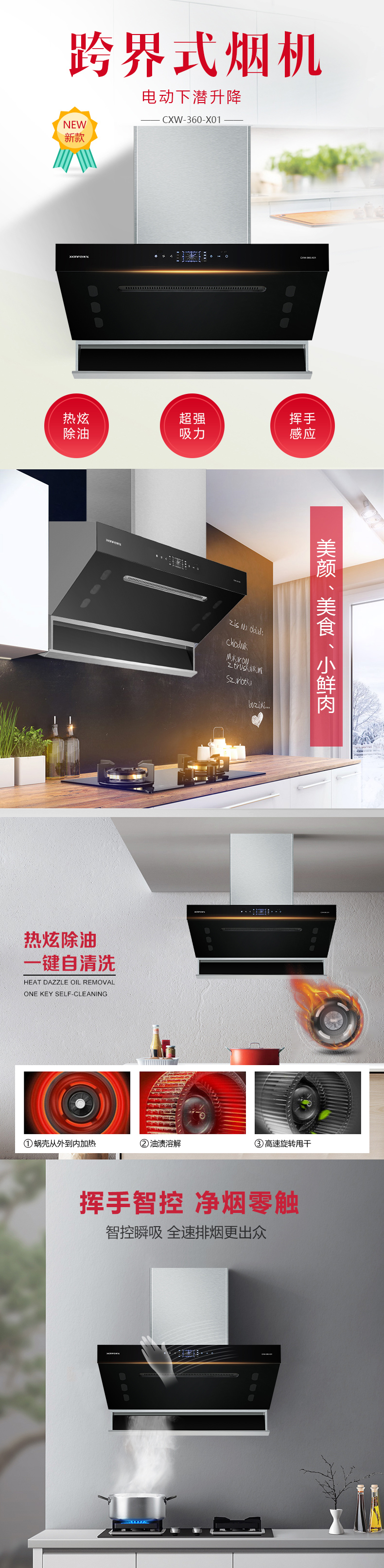 超强下潜式电吸 热炫除油 一键自清洗 挥手智控 净烟零触 反转深吸进风网设计 黑晶玻璃 轻轻一抹 焕然一新 大油杯贴墙设计