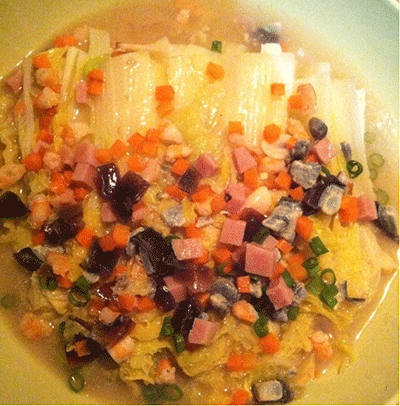 2、将皮蛋、咸肉切小丁和炸蒜末撒在娃娃菜上。(图2)