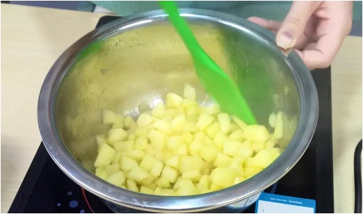 3.此时可以挤入小半个柠檬汁,翻炒苹果粒待苹果变软、锅内水分基本收干即可离火,放凉待用;(图3)