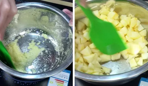 2.苹果削皮去籽,切成小块备用。锅中黄油加热充分融化(最好用不粘锅),倒入砂糖搅拌至完全融化后倒入苹果粒;(图2)