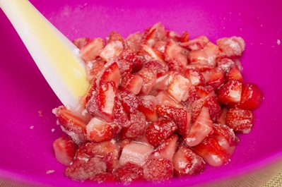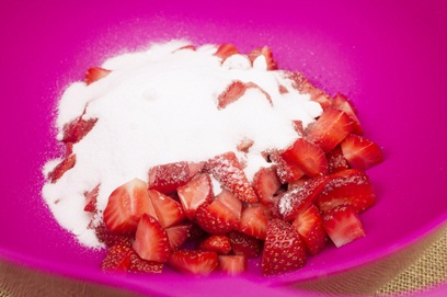 4.切好的草莓丁放入一只干净的大碗中,加入细砂糖;(图4)