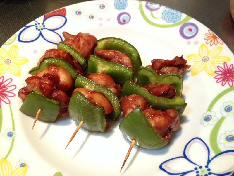 和青椒(或是彩椒、菌菇)相间着串起来,入烤箱200度15分钟。中途刷一至两遍蜂蜜。(附图4)
