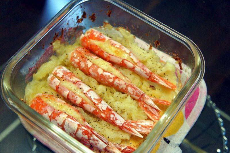 如果是对虾、明虾,开背,切到虾腹不断刀,嵌入芝士,下面铺土豆泥,表面撒少许盐入烤箱,200度20分钟。出炉撒黑胡椒。直接用玻璃器皿烤,又不占锅、不占盆,总之,一切变得很轻松……