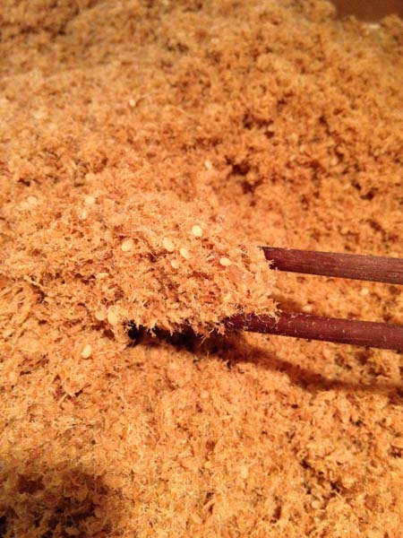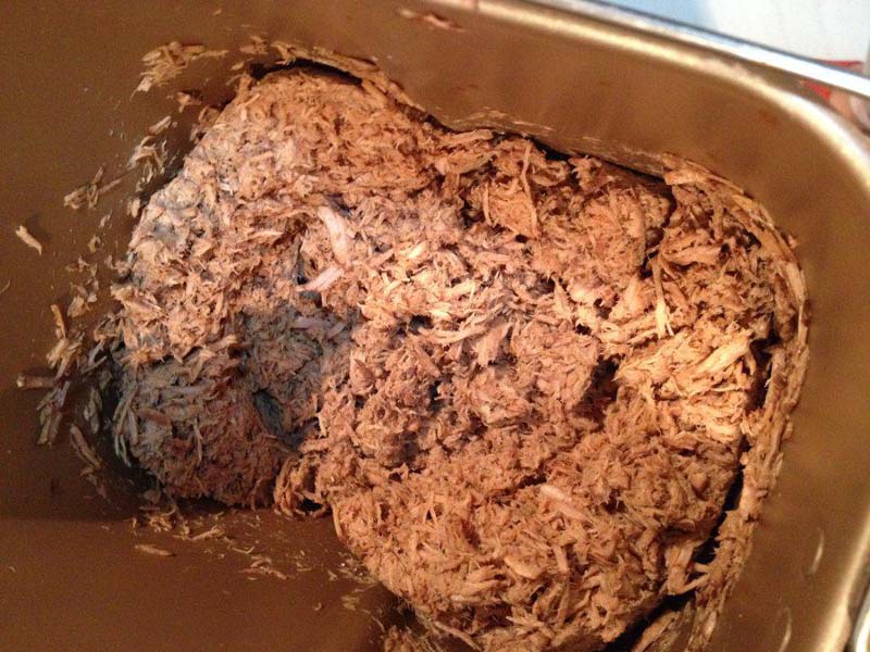 沥掉汤汁,加入糖、油、芝麻、少许五香粉,入面包桶开启和面档,搅至肉纤维成为细丝,这个过程不是太长,约20分钟。如果你的面包机有肉松或果酱程序,这时候就可以开启果酱程序玩去了……如果没有面包机,可以把肉放入保鲜袋,用擀面杖来回搓擀。(附图10)