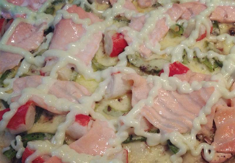 我最喜欢的披萨是多年前必胜客的大西洋珍鲑披萨,自己做也非常简单,披萨饼的具体做法就不赘述了,和面包差不多,就是擀成薄饼状。我就说一下这个披萨的配料,三文鱼+(蟹肉棒、虾仁、鱿鱼条等海鲜自行选择)+青椒+蘑菇+马苏里拉芝士,三文鱼与番茄酱不搭,所以这个披萨不放常规的番茄酱,而是自制一种与三文鱼绝配的酱料(山葵酱或芥末酱+色拉酱,比例约是1:10)。三文鱼待整个披萨烤熟后再平铺在上面,回炉1分钟,出炉挤上特制酱料。(附图15)