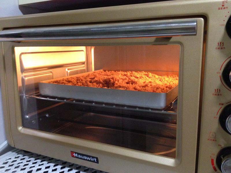 搅得差不多后入平铺在烤盘上,入烤箱,低温100-120度,开启热风(一定要有热风功能的烤箱哦),进行烘干。每过十几分钟翻拌一下。附图11)