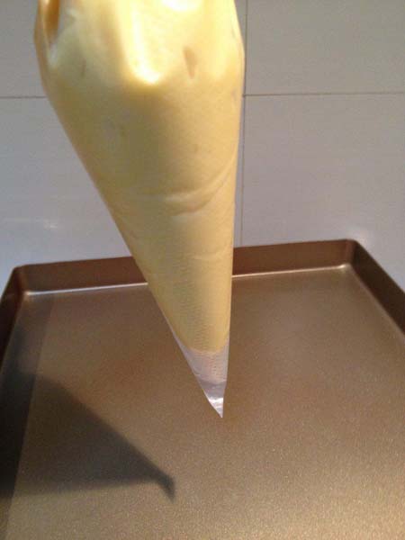 后面的步骤就和网上一样了,待凉后分次加入蛋液,至面糊在筷子头形成倒三角而不滴落的状态,装入裱花袋,挤在烤盘上。(附图19)