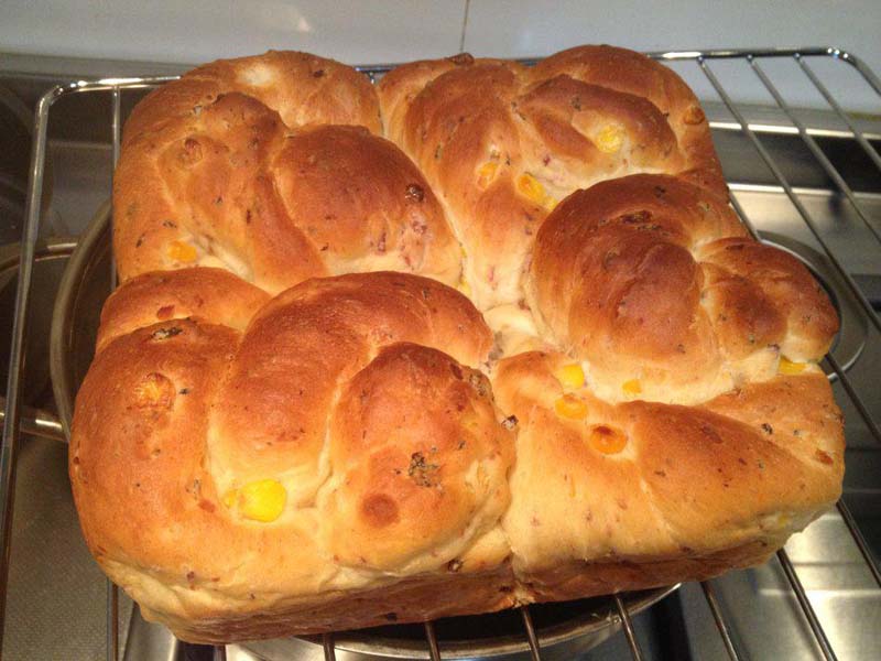 当原味面包都吃腻了以后,除了在面团里加干果葡萄干,也可以尝试着做成咸味面包,加煎过的培根和过水后沥干的玉米。(附图29)