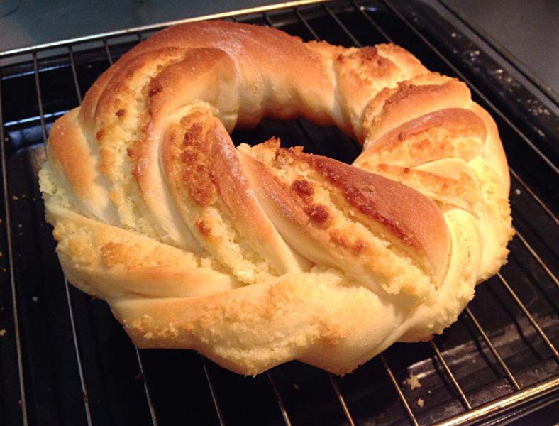 6、将相接的部分塞进圆圈里,表面是5个辫,排到涂过油的烤盘上,放温暖湿润处进行最后发酵。