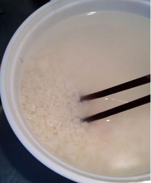 准备一盆凉水,一定要是矿泉水或是凉白开,不能用自来水。做酒酿全程的容器都要干净,用开水烫过,无生水无油。把蒸好的糯米倒入凉水,搅开。一是降温,二是打散米粒。(附图46)