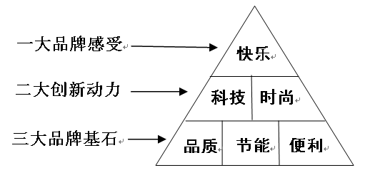 有人可能会讲,快乐会不会飘的太高,离消费者太远啊?其实快乐只是冰山一角,还有七成冰山在水面之下。先飞公司认为,快乐是客户对先飞品牌情感升华后的一大品牌感受,另外先飞品牌还有二大创新动力:科技与时尚;三大品牌基石:品质、节能与便利,共同构成了先飞品牌123定位,如图所示:
