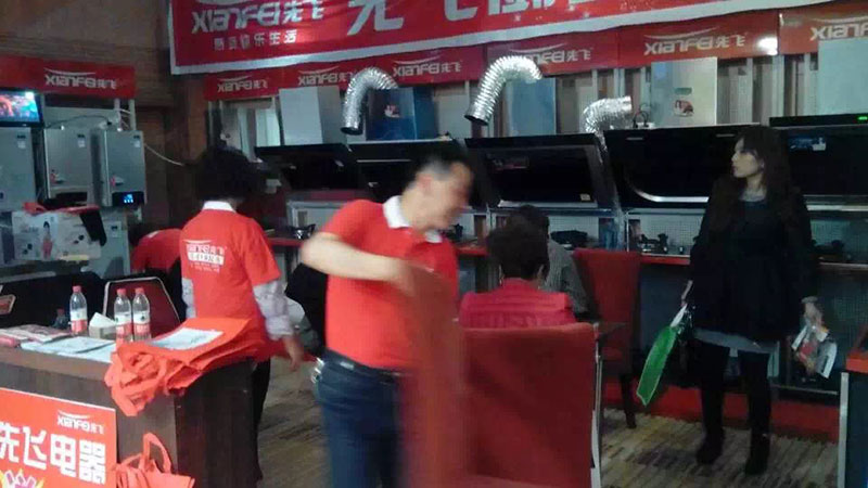2、客户对先飞蒸汽喷洗技术的认同:现场演示机哗哗的冒着白色水蒸气,客户里里外外围观,那个效果太彪悍了,充分展示了先飞蒸汽喷洗烟机的效果。