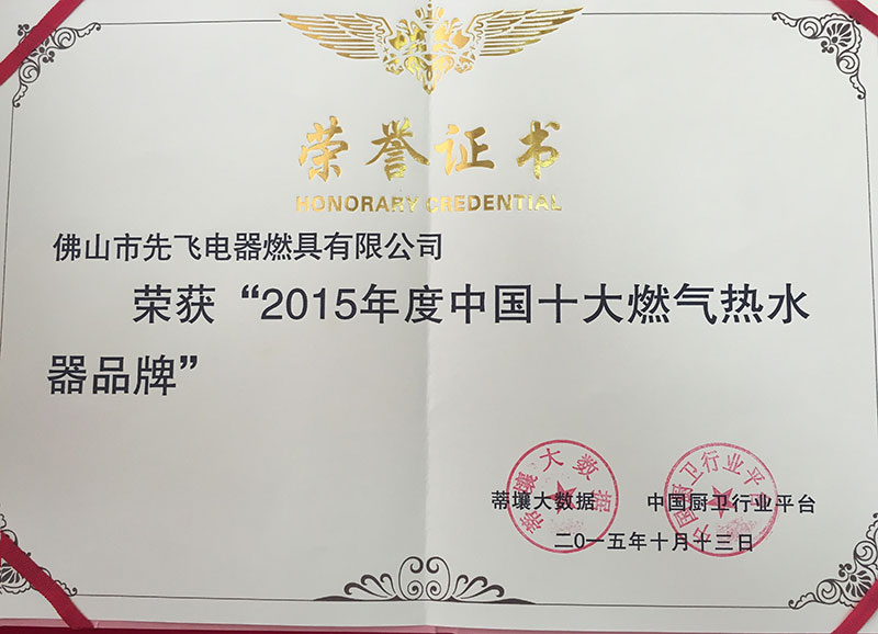 2015年10月15日,中国厨卫行业平台公布了“2015年度十大燃气热水器品牌”榜单,先飞公司荣获“2015年度十大燃气热水器品牌”。