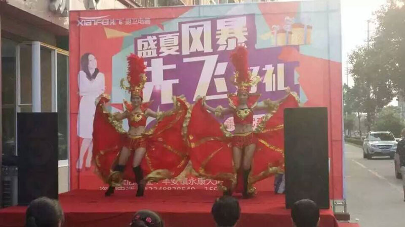 2015年7月11日,先飞电器在羊安部署了强大的促销阵容,一字排开的活动展架,促销物料和服装统一,英姿飒爽的促销团队集体亮相,闪亮登场,一场真正的促销推广大戏大幕正式拉开。精致的产品,精干的团队,精美的礼物,精彩的歌舞,带给客户的真真切切的实惠,活动吸引了众多客户驻足观看,仔细了解后纷纷下单。