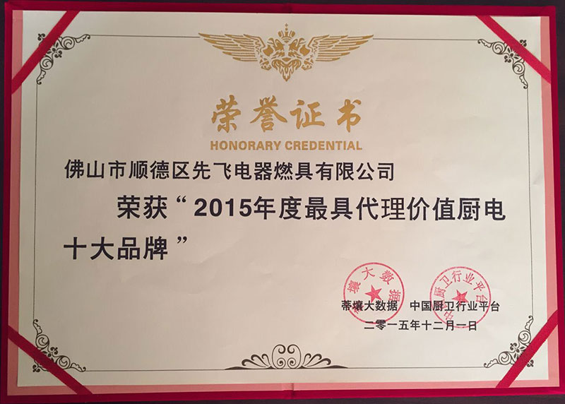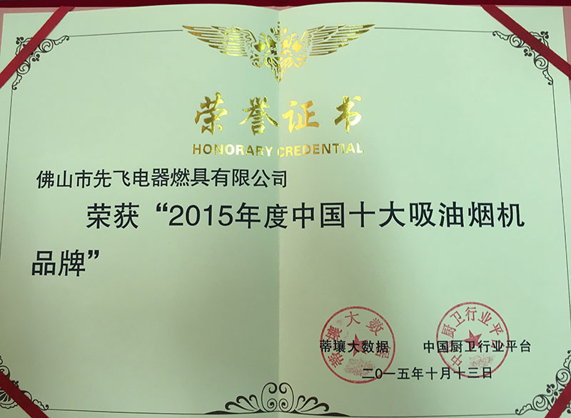 二.2015年10月,先飞公司斩获“2015年度中国十大吸油烟机品牌”!