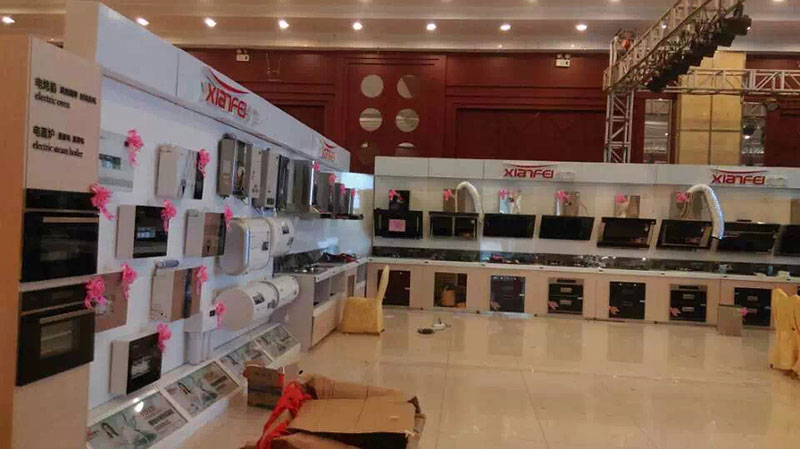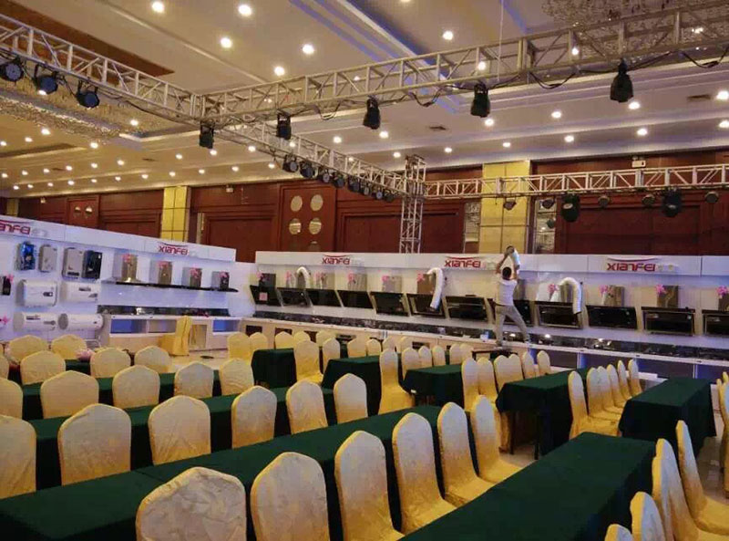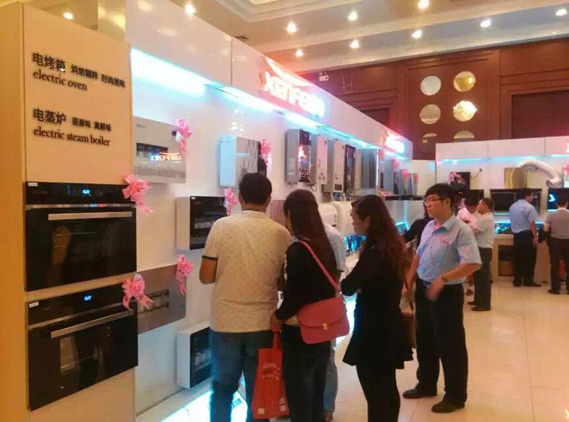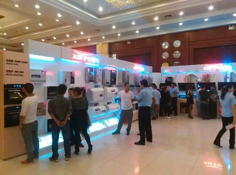 会议现场,先飞的产品阵容更为强大!22米2018款展台一字排开,烟机陈列苛求到使用激光水平仪来保持平整,更为创意的是:现场提供液化气罐来为客户点火试验,阵阵蛋挞香,更是把先飞新品——蒸箱烤箱体验式的呈现在了客户的面前,又怎能不吸引客户目光?!先飞净水——同样让客户产生了浓厚的兴趣!