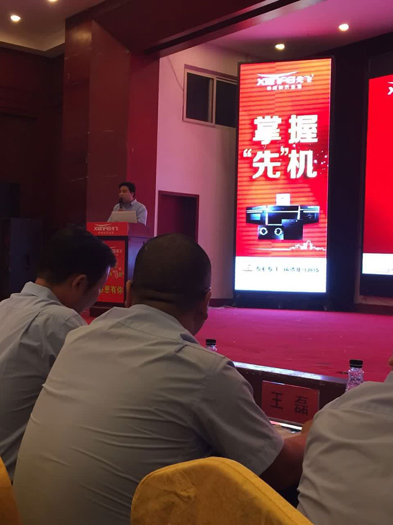会议于下午4点20分准时开始,邯郸先飞高总致欢迎词,同时就前期销售工作做以总结,并就旺季启动工作做了说明!先飞总部黄总,就先飞公司发展历史、先飞产品过人配置,过硬的品质向与会客户做了讲解!先飞河北大区赵经理,重点讲解了先飞新品,同时做了邯郸、邢台先飞旺季启动的承诺与执行!大家的讲解,获得了客户的阵阵热烈掌声,也取得了大家的高度认同!