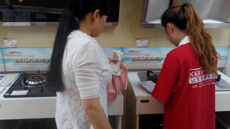“在这边来交钱吧?”(在成交时特别提醒销售员朋友们不要说“钱”这个字。)