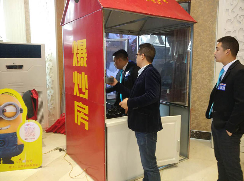 先飞时尚的产品挂在白色高档烤漆背板上,高端大气上档次。随处可见的二维码,在展厅布置得错落有致,层次分明。经销商们掏出手机就能轻松了解更多产品,将线上线下无缝对接。蒸雾锅和爆炒房可以让大家更为直观的看到产品的效果。