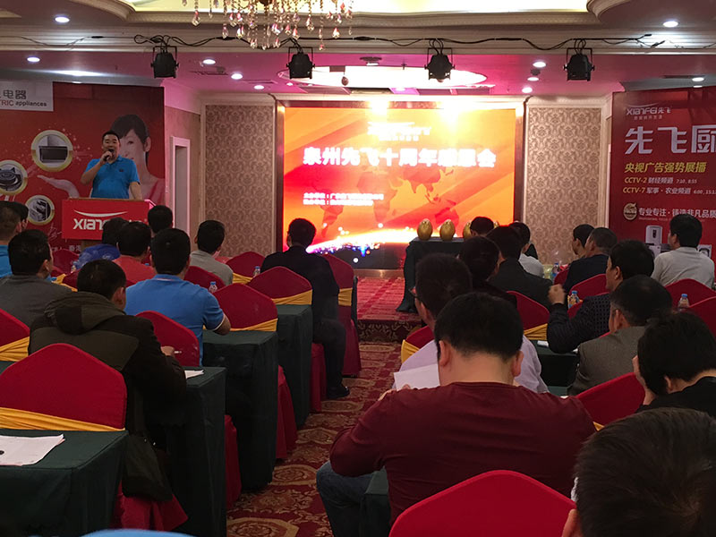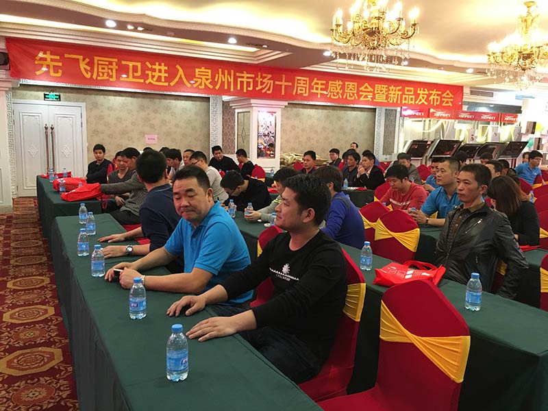 2016年4月12日下午,在福建省泉州市明发大酒店二楼宴会厅内,先飞厨卫进入泉州市场十周年感恩会暨2016春季新品发布会正在热火朝天举办中!