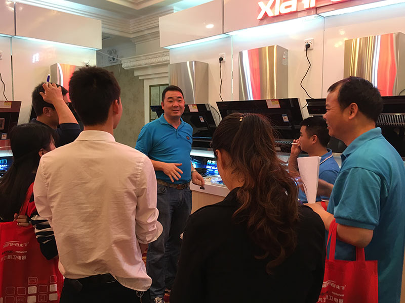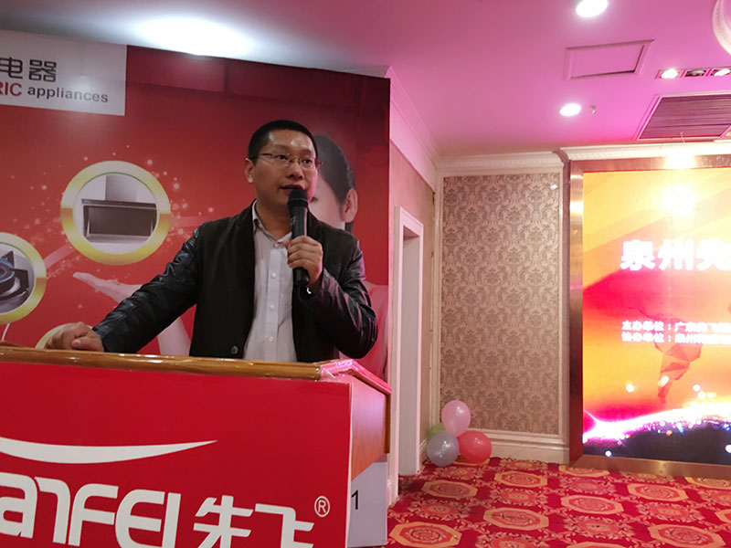 先飞掌门人黄总不仅在会前给泉州先飞业务团队作了产品讲解,而且在会上给大家作了非常详细的产品指引,赢得大家阵阵掌声!先飞聂总给大家分享了烟机、灶具等厨卫新品知识,净水器主管陈磊给大家分享了净水器产品知识,先飞大区经理林俭富作为会议主持人贯穿全场。