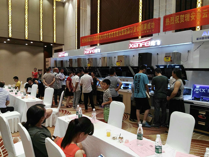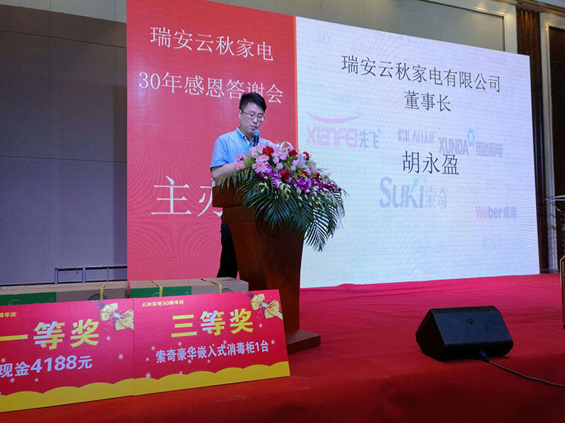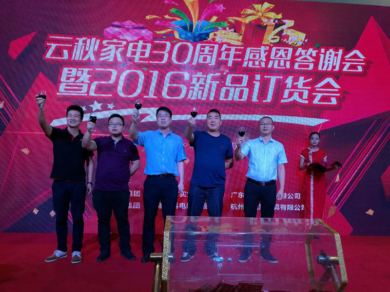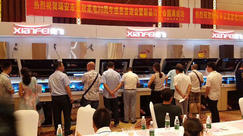 编者按:2016年8月8日下午,云秋家电30周年感恩答谢会暨2016年先飞秋季新品订货会在瑞安喜来君悦大酒店火爆召开!温州地区参会经销商朋友多达30桌,近300多人。在云秋家电30周年之际,先飞公司董事长黄汉腾先生在会上回顾往昔,展望未来,分享先飞公司近况与新品,赢得大家热烈掌声!会议期间收款超过300万,标志着会议圆满成功!