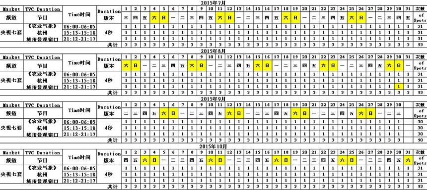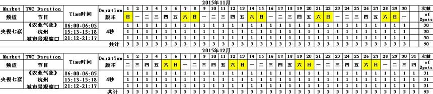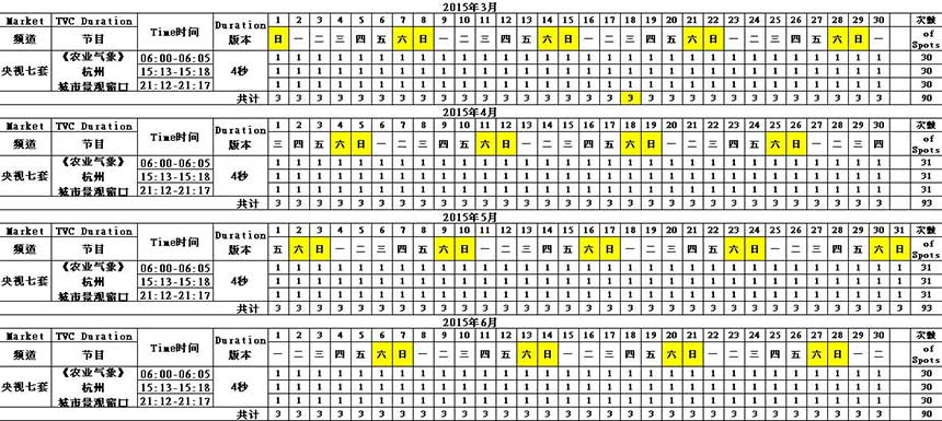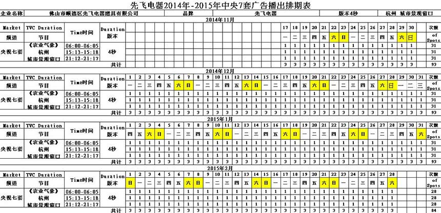 2015年先飞公司将在CCTV-7央视频道《农业气象》天气预报之“杭州”城市板块植入广告,广告时间为2014年11月17日至2015年12月31日,每天三次(06:00-06:05;15:13-15:18;21:12-21:17),详细排期情况请上公司官网(http://www.xianfei-china.com/)查看《先飞电器2015年中央电视台广告播出排期表》。