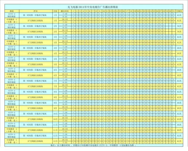 2014年1月1日-12月31日期间,先飞公司在全国权威电视媒体CCTV-2、CETV-1投放全年电视广告,这是以城市居民、工薪阶层、白领、老板等为主要目标受众,有效提升了先飞品牌在全国大、中、小城市的曝光率与知名度,积极推动了先飞产品在全国各区域市场的上柜率与销售额。