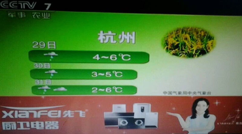 先飞在CCTV-2投放的仍是早间节目《第一时间 第一印象》之天气预报板块,2015年全年播放,每天两次:7:10一次、8:55一次。先飞在CCTV-7投放的栏目是《农业气象》,2015年全年播放,每天三次:06:00-06:05;15:13-15:18;21:12-21:17。