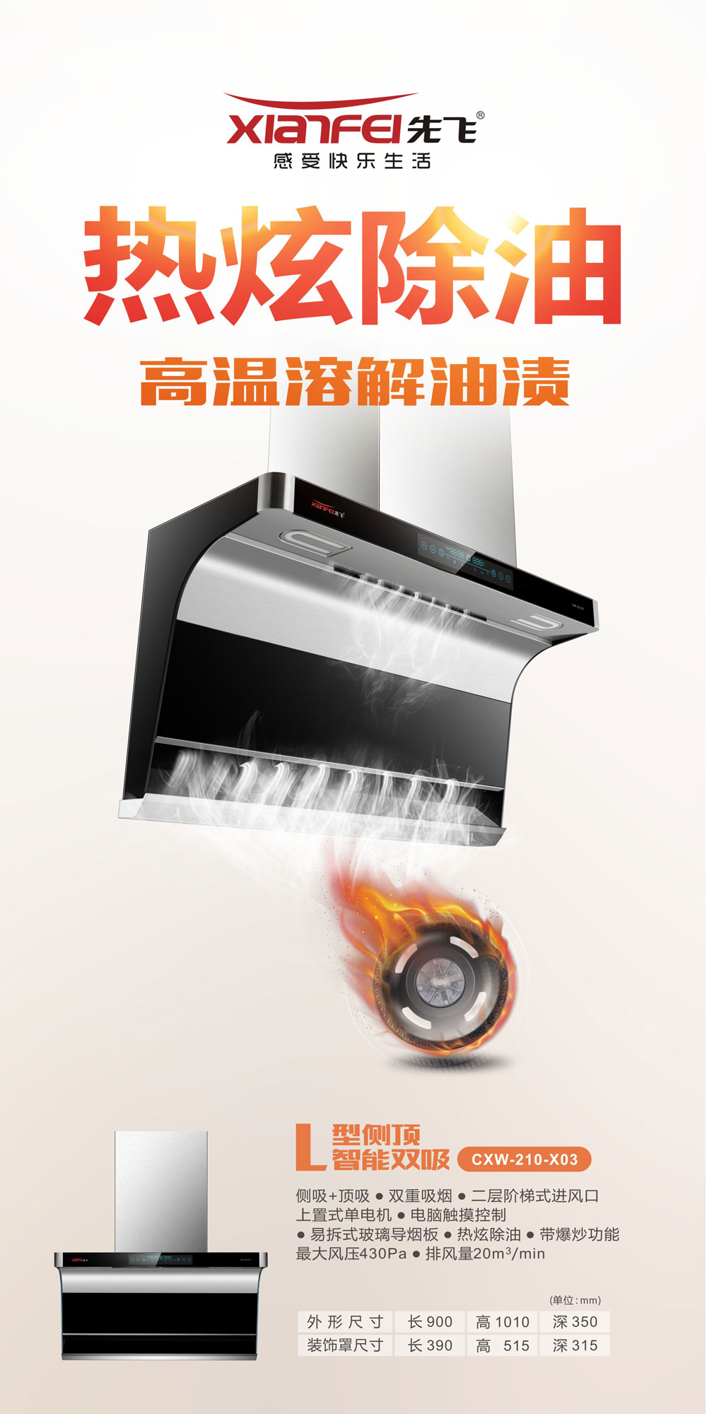 欧式顶吸+近吸式呈90度垂直“L”型设计;