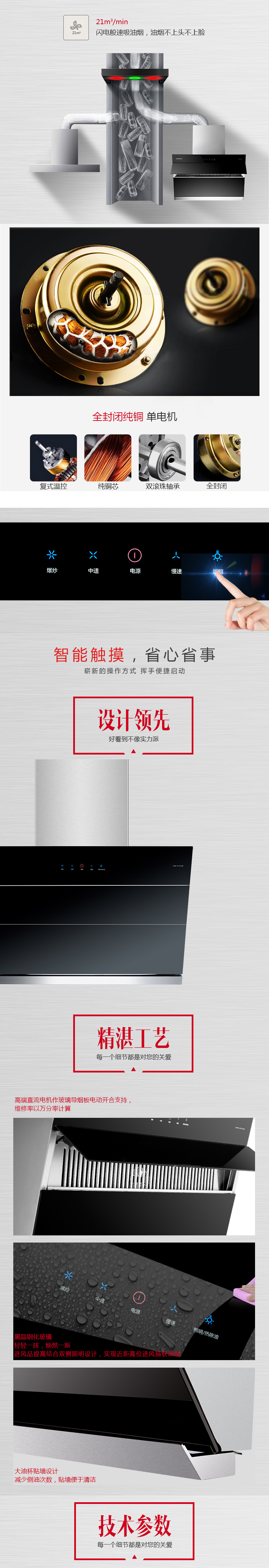 热炫除油 一键自清洗 超强吸油动力 挥手智控 净烟零触 电动推杆开合 反转深吸进风网设计 黑晶玻璃 轻轻一抹 焕然一新 大油杯贴墙设计 闪电般速吸油烟 21m³/min
