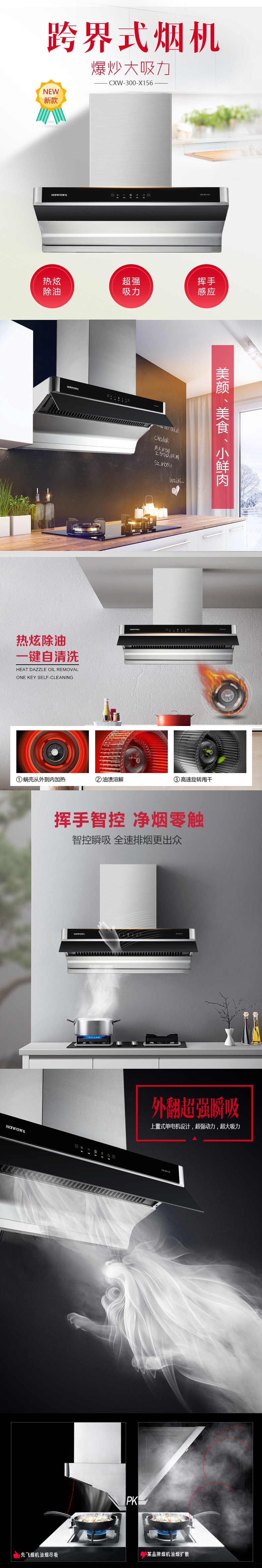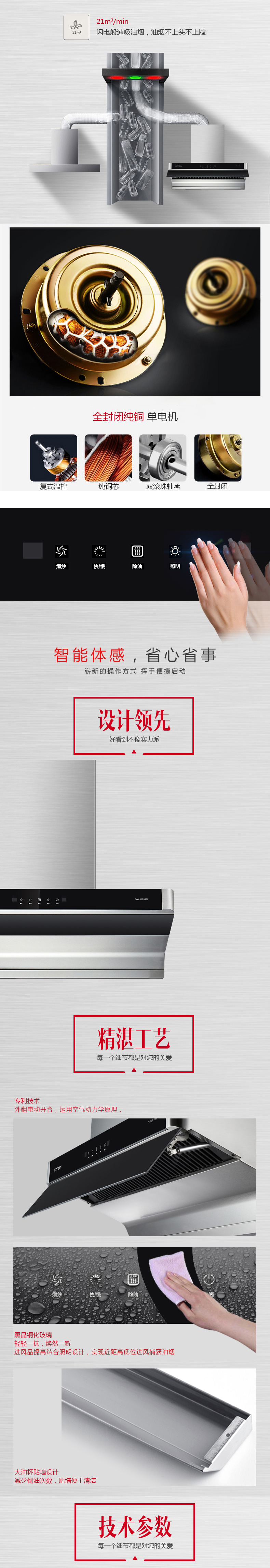 热炫除油 一键自清洗 爆炒大吸力 外翻电动开合 超强吸油动力 挥手智控 净烟零触 黑晶玻璃 轻轻一抹 焕然一新 大油杯贴墙设计 闪电般速吸油烟 21m³/min