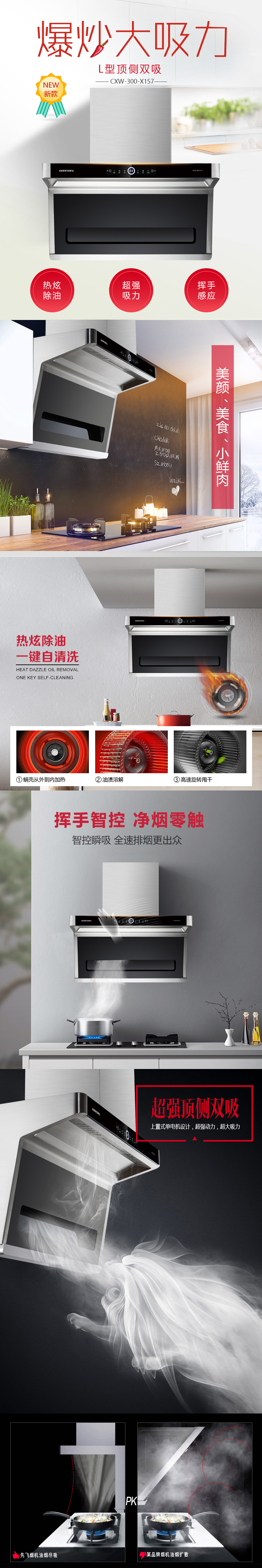 热炫除油 一键自清洗 爆炒大吸力 L型顶侧双吸 超强吸油动力 挥手智控 净烟零触 黑晶玻璃 轻轻一抹 焕然一新 大油杯贴墙设计 闪电般速吸油烟 23m³/min