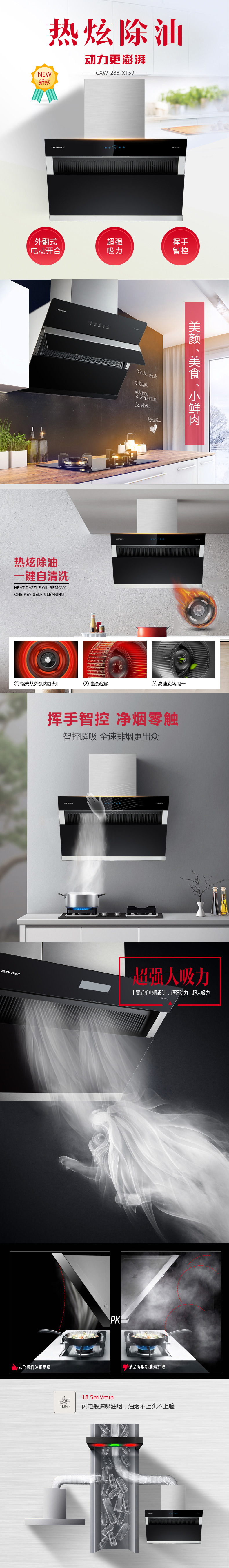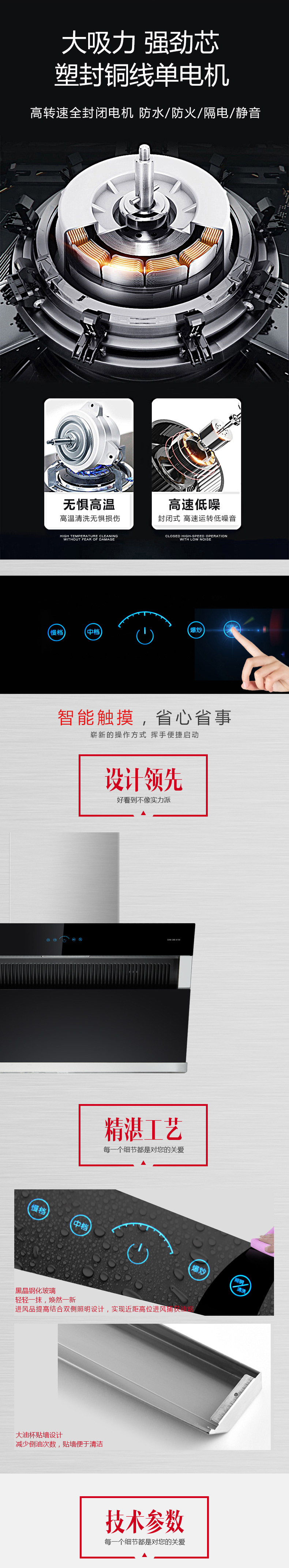 热炫除油 一键自清洗 爆炒大吸力 超强吸油动力 挥手智控 净烟零触 黑晶玻璃 轻轻一抹 焕然一新 大油杯贴墙设计 闪电般速吸油烟 18.5m³/min